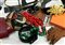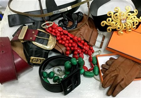 Lotto composto da varie cinture di modelli, materiali e colori diversi, alcune paia di guanti, collane di foggia etnica e una scotala di bottoni. Il tutto in uno scatolone (difetti e segni d'uso)