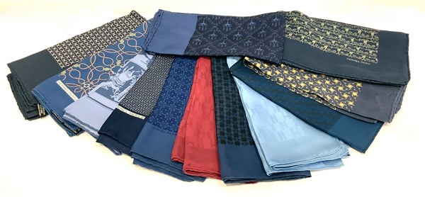 Lotto composto da dodici mini carré in seta, utilizzabili anche come pochette da uomo, in vari colori, prevalentemente nei toni del blu (cm 40x40) (difetti e segni d'uso)