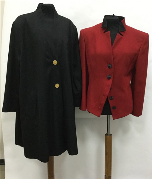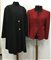 Lotto composto da un caban nero in gabardine con bottoni color oro logati e una giacca rossa sciancrata in tessuto canneté con revers neri (tg. 40 fracese)