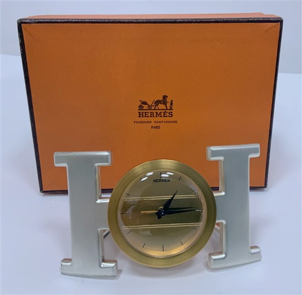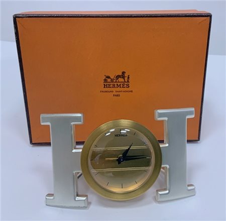 HERMÈS Sveglia da tavolo "H" in metallo color oro e argento, con scatola origi