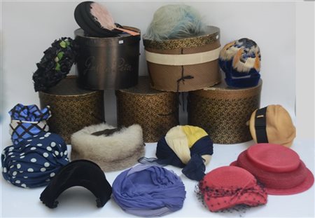 Lotto di varie cappelliere contenenti cappelli e fascinators per signora (difetti e segni d'uso)