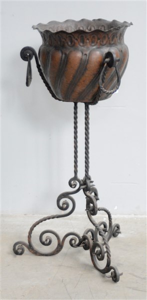 Vaso portafiori in rame sbalzato con portavaso in ferro battuto (h cm 79) (difetti)