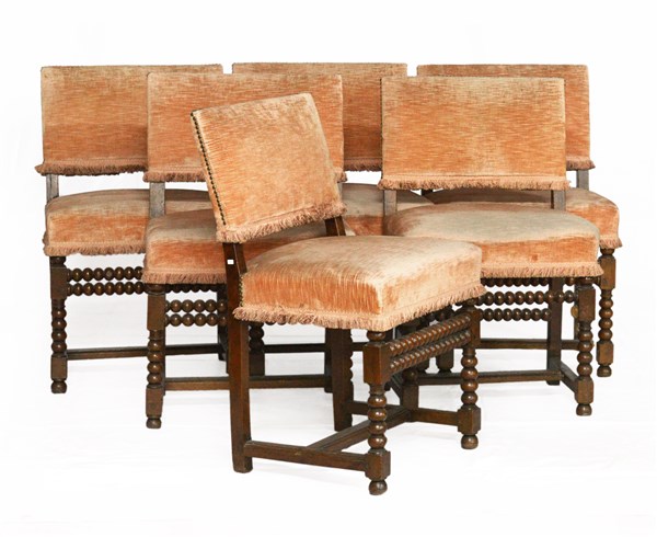Gruppo di sei sedie con gambe anteriori e fascia tornite a rocchetto, traverse