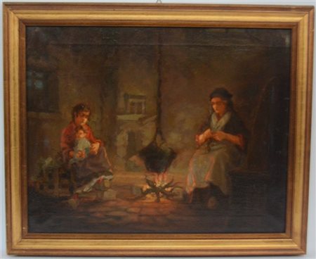 "Il focolare" olio su tela (cm 50x63) Firmato in basso a sinistra. In cornice (difetti)