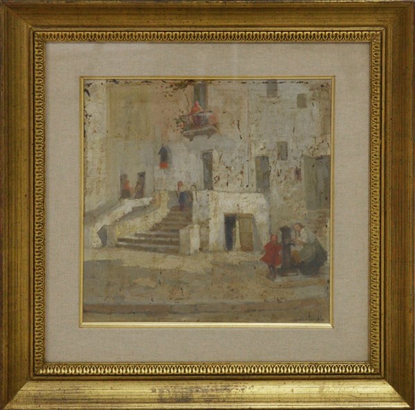 Firma indecifrata "Scorcio di paese" 1933, olio su compensato (cm 32x32) Firmato e datato in basso a destra. In cornice