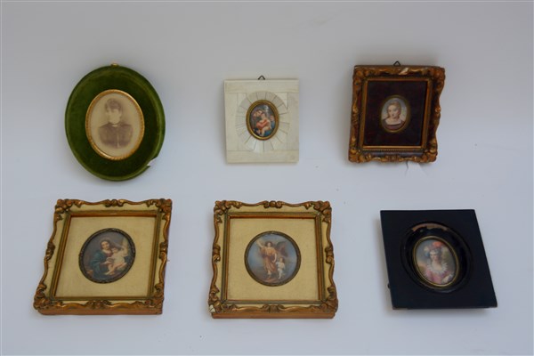 Lotto composto da cinque miniature e una foto d'epoca in cornici (difetti)
