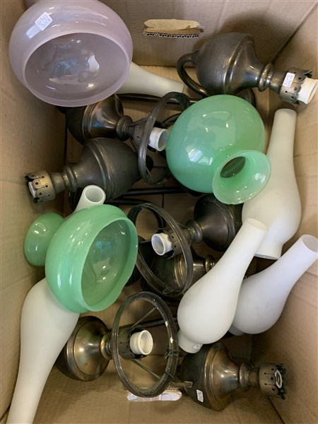 Lotto composto da tre appliques in metallo a tre luci con paralumi in vetro lat