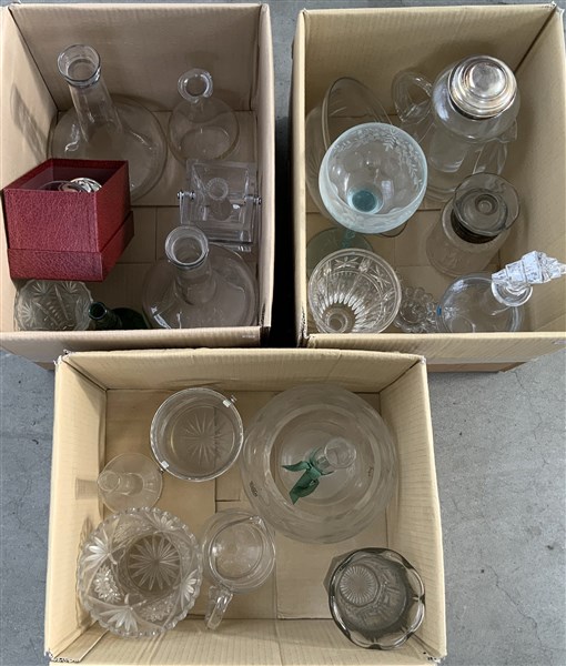 Lotto di tre cartoni contenenti numerosi vasi e oggetti in vetro di fatture differenti (difetti)