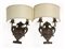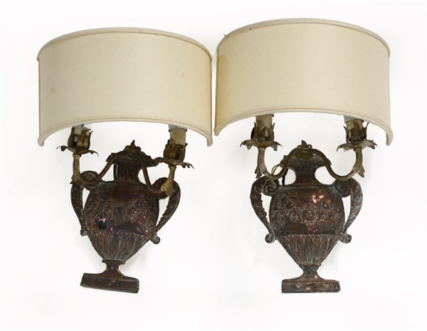 Coppia di portapalme in rame sbalzato del secolo XIX, montati ad appliques a due fiamme in epoca posteriore, paralumi in stoffa in stoffa (difetti)