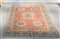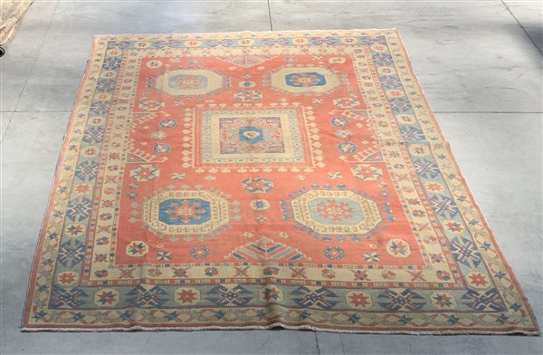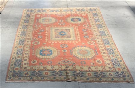 Decoro di origine caucasico geometrico nei toni del beige, azzurro, blu e rosso su fondo rosa. (cm 300x212) (difetti)
