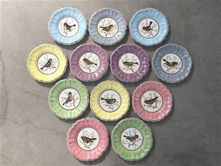 Manifattura Este, gruppo di dodici piatti decorativi dipinti con varietà di ucc