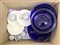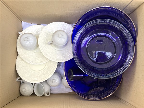 Cartone contenente parti di servizi per la tavola in vetro e porcellana, di man