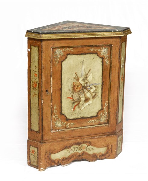 Antica angoliera ad un'anta laccata e dorata dipinta a maschere e strumenti musicali e finto marmo (cm 74x96x45) (difetti)