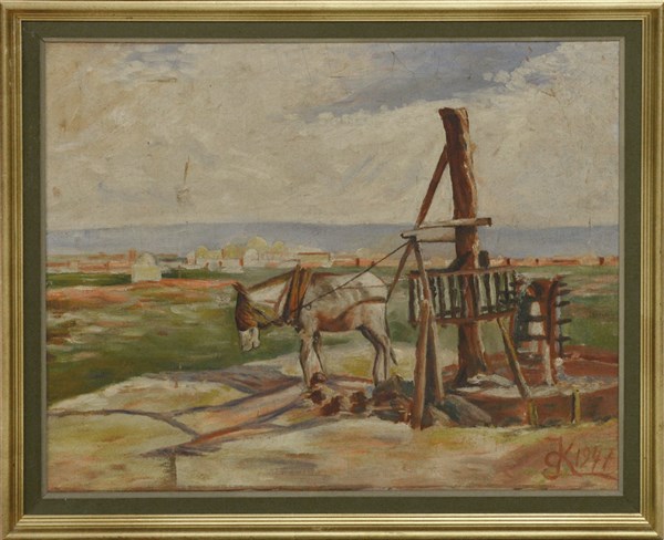 Firma indecifrata "Paesaggio con mulo" 1947 olio su tela (cm 52x67) siglato K e datato in basso a destra, in cornice