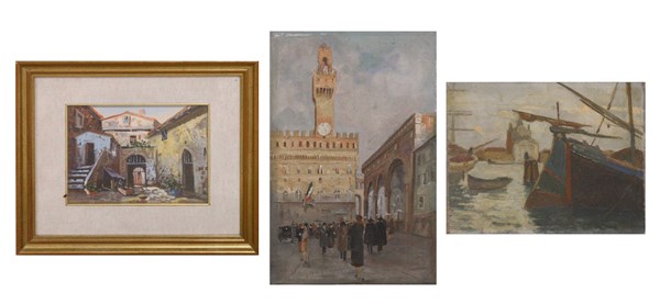 Lotto composto da tre dipinti ad olio raffiguranti "Barche all'ormeggio", "Scorcio di piazza" e "Scorcio di paese", autori e misure diverse. Uno dei tre in cornice