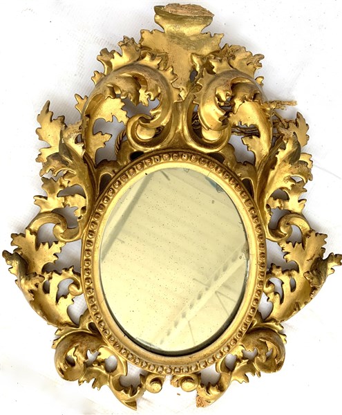 Piccola specchiera del secolo XIX in legno scolpito e dorato (h cm 50 ca) (dif