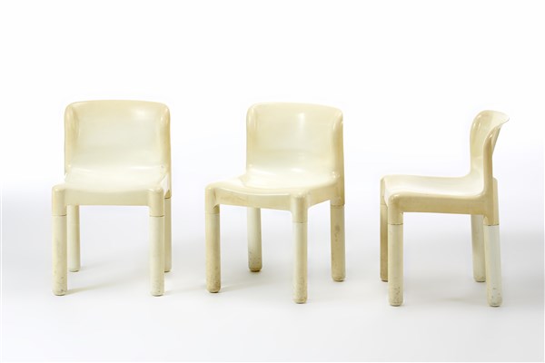 Lotto di tre sedie modello "4875". Produzione Kartell, Milano, anni '70. Plastica stampata bianca. Marcate sotto la seduta. (cm 44x71x49) (difetti)