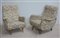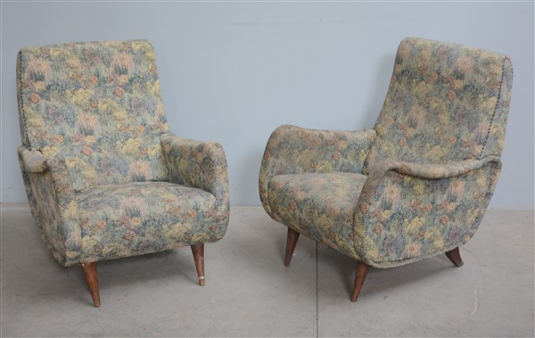 Coppia di poltroncine con struttura in legno, imbottite, rivestite in tessuto a fiori. Italia, anni '50. (cm 74x87x75) (gravi difetti)