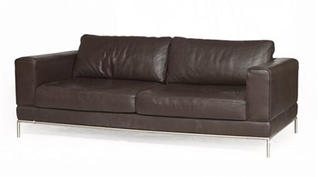 Divano a due posti imbottito in pelle color testa di moro, struttura in acciaio