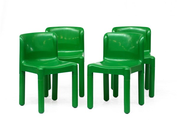 Quattro sedie modello "4875". Produzione Kartell, Milano, 1992. Plastica stampata verde. Marcate sotto la base. (cm 44x71,5x44) (lievi difetti)