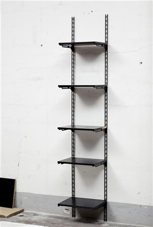 Libreria a cinque ripiani regolabili in legno verniciato nero, montanti a scala in acciaio verniciato. Italia, anni '60. (cm 38x200x28) (lievi difetti)
