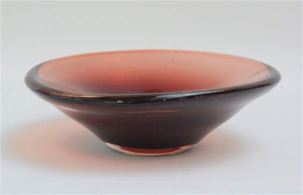 Centrotavola di forma sagomata in vetro massello trasparente color vinaccia. Svezia, anni '50/'60. Firmato e numerato a punta sotto la base. (h cm 8; d cm 23) (lievi difetti)