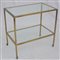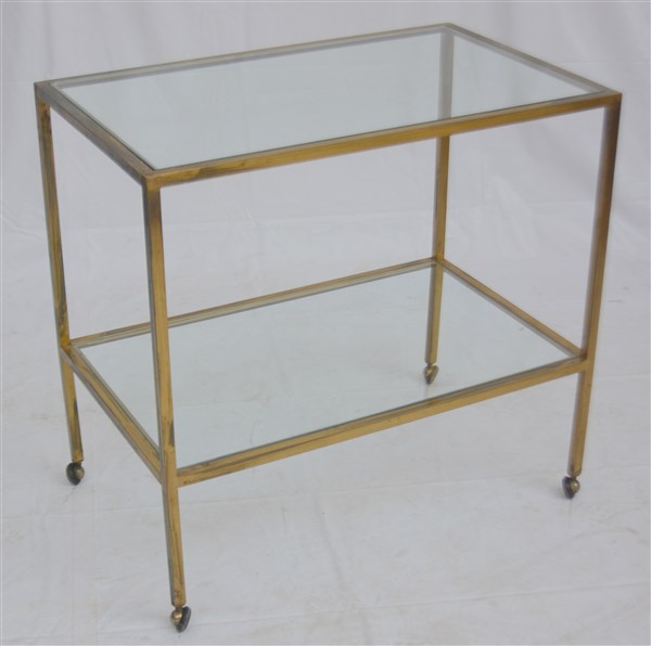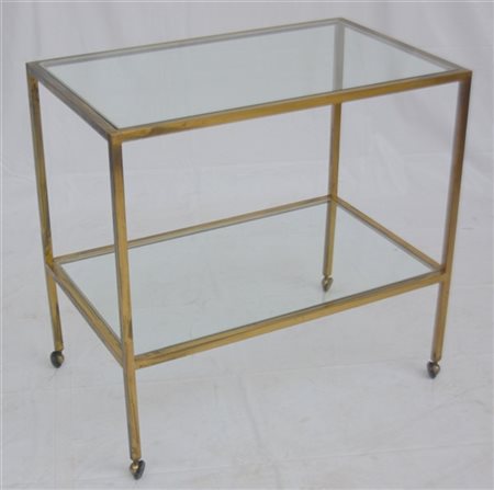 Carrello su rotelle a due ripiani in cristallo molato, struttura in ottone. Ita