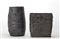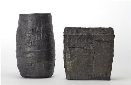 Lotto di due vasi in gres graffito e smaltato a lustro metallico grigio di forma cilindrica e parallelepipeda. Italia, anni '80. Firma sotto la base. (h max cm 43) (gravi difetti)
