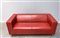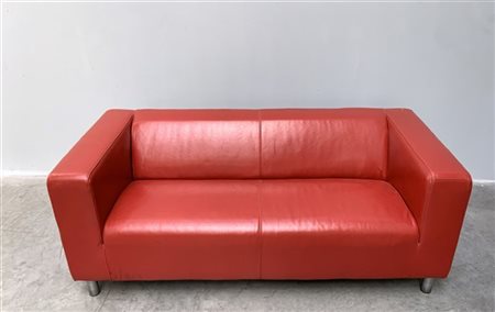 Divano a due posti imbottito e rivestito in similpelle rossa con gambe cilindriche in metallo. Italia, anni '90/2000. (cm 177x67x87) (lievi difetti)