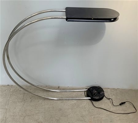 Lampada alogena ad arco modello "Gesto". Produzione Skipper, Italia, 1975. Struttura in acciaio cromato ricurvo, sostegno e plafoniera in metallo laccato nero. (cm 95x94x18) (lievi difetti)
