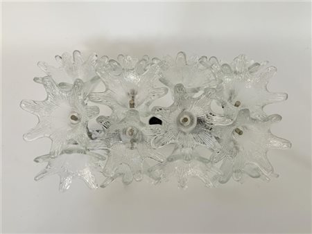 Lampada da parete a tre luci con struttura in metallo cromato ed elementi decorativi a forma di fiore in vetro stampato trasparente incolore. Italia, anni '90. (cm 24x38x20) (piccole mancanze e sostituzioni)