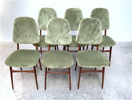 Lotto composto da sei sedie con struttura in legno di palissandro indiano, seduta e schienale rivestiti in velluto verde. Italia, anni '50. (cm 43x94x51) (lievi difetti)