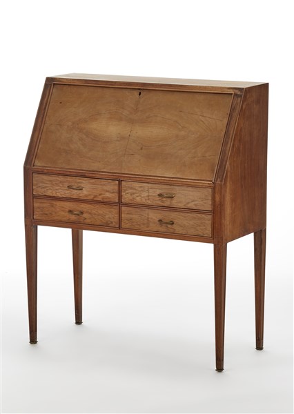 Scrittoio a ribalta e quattro cassetti in legno massello e impiallacciato con piedini e maniglie in ottone. Italia, anni '40. (cm 90x108,5x40) (lievi difetti e mancanza della chiave)