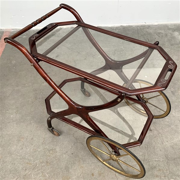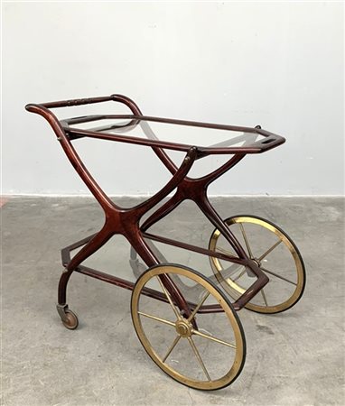 Carrello con struttura in legno di mogano massello, due ripiani in vetro e minuterie in ottone. Italia, anni '50. (cm 75x75,5x49) (lievi difetti)