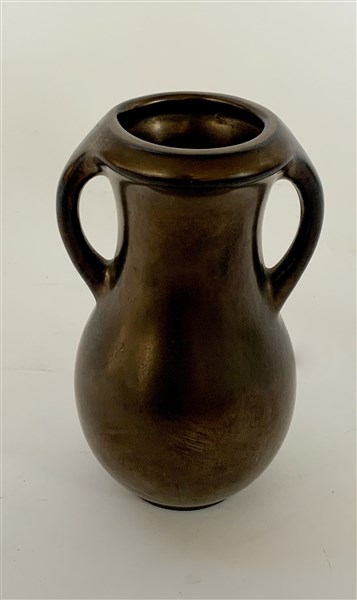 Piccolo vaso biansato smaltato a lustro metallico bronzeo. Anni '40/'50. (h cm 14)