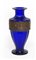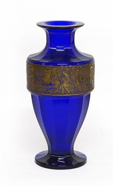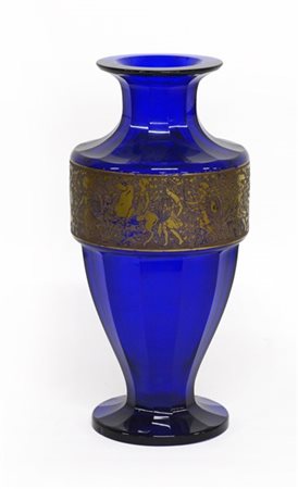 Vaso in cristallo blu con fascia dorata decorata con scene classicheggianti. Cecoslovacchia, secolo XX. Firmato a punta sotto la base. (h cm 35) (difetti)