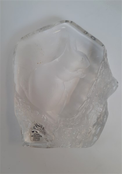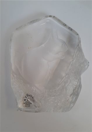 Fermacarte in cristallo con figura di scoiattolo. Svezia, anni '90. Recante etichetta adesiva. (h cm 10,5)