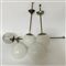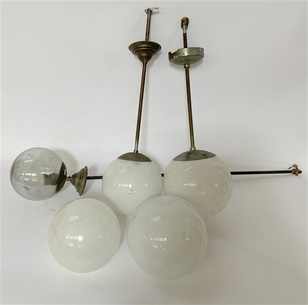 Lotto di tre lampade a sospensione con struttura in metallo e paralume a sferico in vetro incamiciato lattimo e trasparente uniti a due paralumi in vetro incamiciato lattimo. Secolo XX. (misure diverse) (difetti)