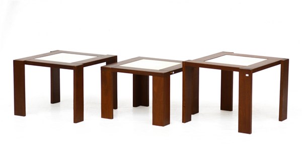 Gruppo di tre tavolini a nido con piano quadrato, struttura in legno di noce massello e in compensato verniciato bianco. Italia, anni '70. (cm 45x32,5x45; cm 49x35x49; cm 49x38,5x49) (lievi difetti)