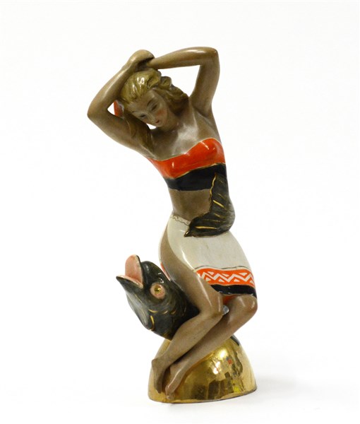 "Donna con pesce" Scultura in ceramica formata a colaggio e smaltata in policro
