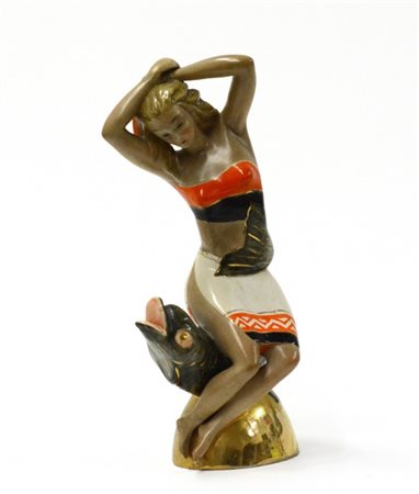 Scultura in ceramica formata a colaggio e smaltata in policromia opaca e sotto vetrina con parti dorate. Secolo XX. (h cm 37) (gravi difetti e restauri)
