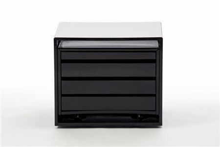 Cassettiera su rotelle. San Lazzaro di Savena, 1984. Legno laccato nero. (cm 66x57x66) (difetti e mancanza della chiave)