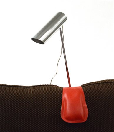 Lampada da lettura modello "Margaret". Produzione Candle Gruppo Fontana Arte, Italia, produzione recente. Faretto in alluminio lucidato, braccio telescopico in ottone cromato. Sacca d'appoggio in pelle rossa. Recante etichetta cartacea adesiva. (h max cm 66) (lievi difetti)