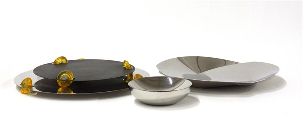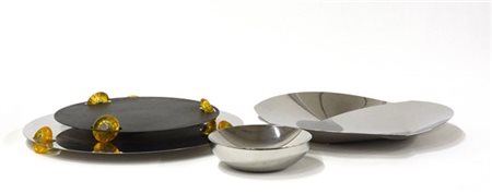 Lotto composto da un centrotavola di Alice Abi, modello "Resonance", produzione Alessi, Italia, 2006, in acciaio inossidabile, marcato a incussione sotto la base, un centrotavola girevole di Groove Design composto da due piatti in metallo cromato e brunito a rotelle in plastica trasparente arancione, produzione Zani & Zani, Italia, anni duemila, marcato a incussione sotto la base ed una ciotola di Donato d'Urbino e Paolo Lomazzi modello "Doubla", produzione Alessi, Italia, 2002 in acciaio inossidabile, marcato a incussione sotto la base. (misure diverse) (lievi difetti)