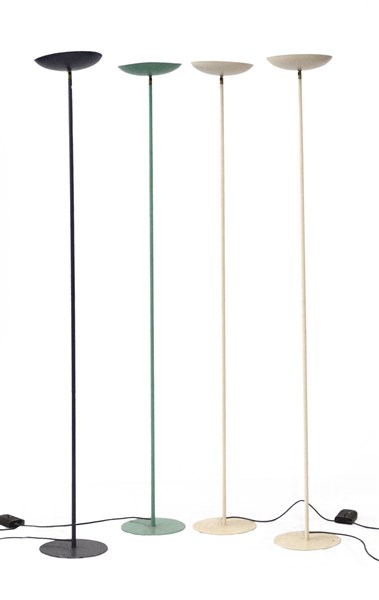 Lotto composto da quattro lampade da terra alogene in metallo verniciato bianco, verde e viola, paralume a coppa orientabile e snodo in ottone. Italia, anni '80. (h cm 177,5) (difetti)