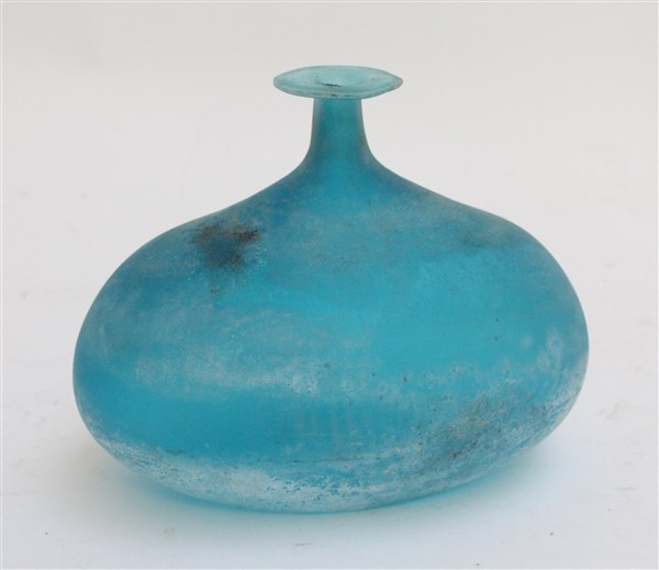 Vaso soliflore in vetro soffiato e acidato a "scavo" sulla superficie esterna azzurro. Murano, anni '50/'60. Firmato a punta e recante etichetta cartacea adesiva con numerale sotto la base. (cm 20x17x16) (lievi difetti)