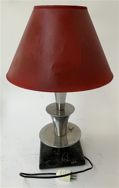 Lampada da tavolo a una luce con fusto in alluminio, base in marmo nero venato, paralume in carta verniciata rossa. Italia, anni '80/'90. (h cm 50) (difetti)