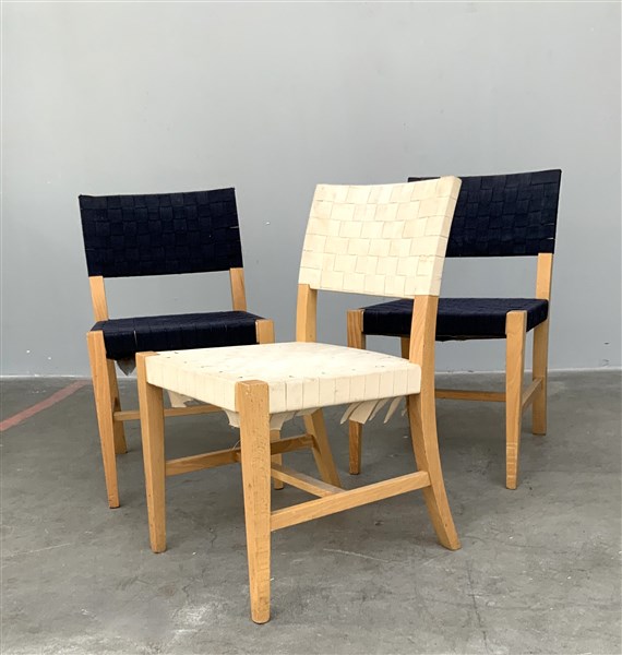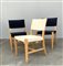 Lotto composto da tre sedie con struttura in legno di chiaro massello, due rivestite in tessuto blu e una in tessuto bianco. Italia, anni '90/2000. (cm 46x76x45) (lievi difetti)