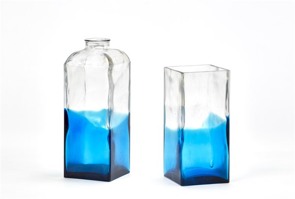 Lotto composto da un vaso a sezione quadrata e una bottiglia in vetro soffiato trasparente incolore e azzurro. Murano, anni '70. Firmati a punta sotto la base. (Vaso cm h23; bottiglia cm h 28,5)
