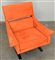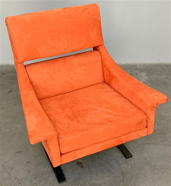 Poltrona. Meda, anni '50. Struttura in acciaio verniciato nero e rivestimento in alcantara arancione. Recante etichetta della produzione sotto la seduta. (cm 86x90x80) (lievi difetti e restauri)
